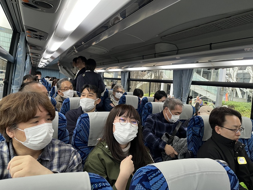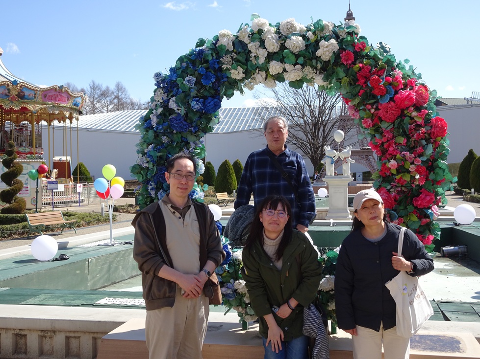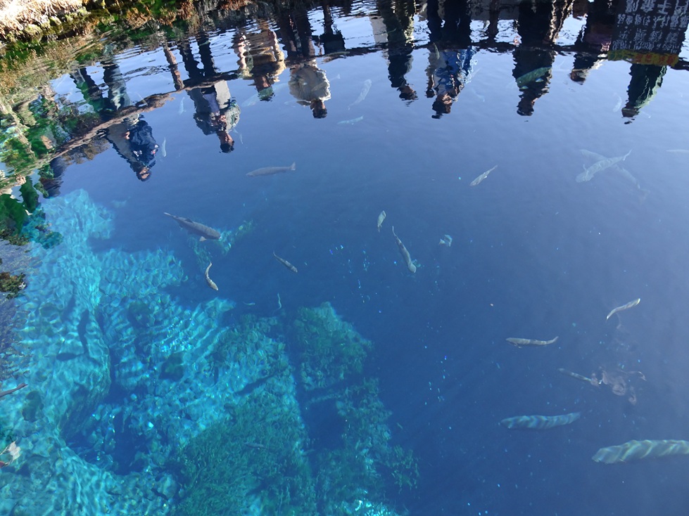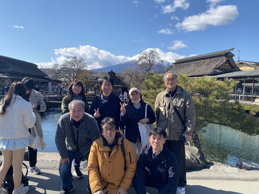 新宿に集合して全員バスに乗り込み、日本風景と清らかな水が湧く神秘的なパワースポット忍野八海で記念写真。